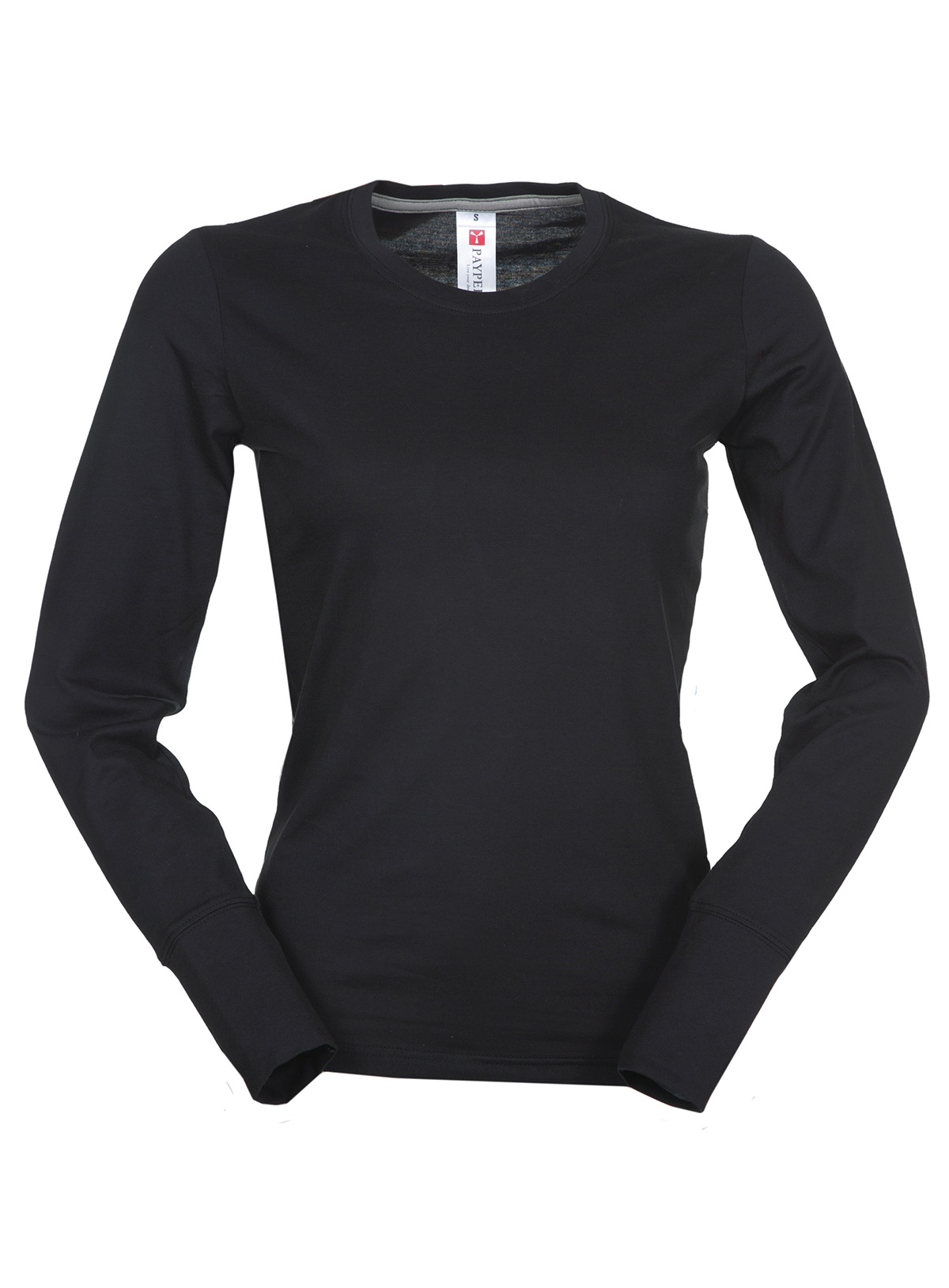 T-shirt girocollo manica lunga da donna, colletto e polsino in costina misto spandex con cucitura ribatutta sul davanti, nastro di rinforzo da spalla a spalla, cucitura laterale per una migliore vestibilità.