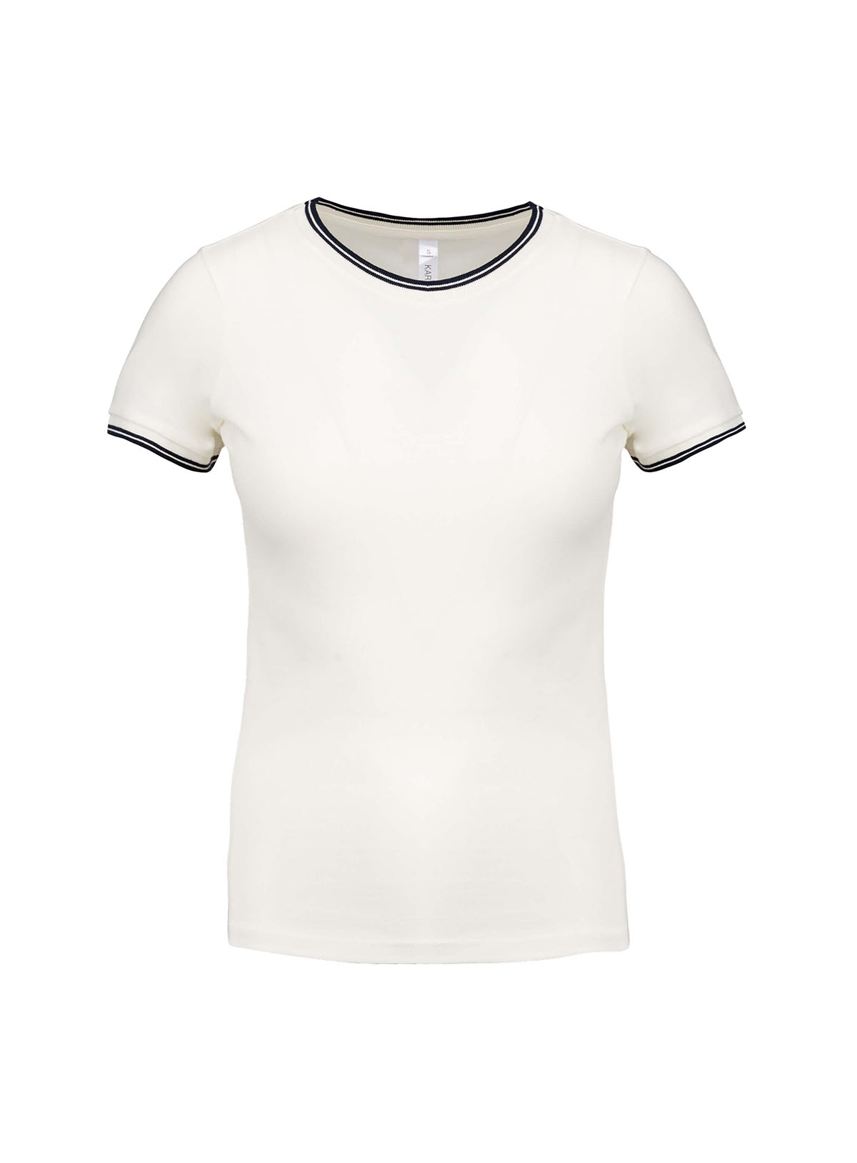Collo e fondo manica a costine con righe a contrasto. Nastrino di rinforzo sul collo. Finitura a doppia impuntura a fondo capo.