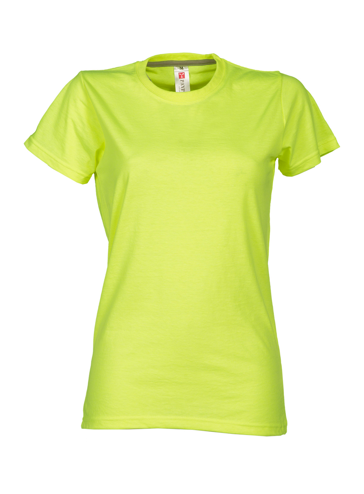 T-shirt girocollo manica corta da donna, colletto in costina misto spandex da 1.5 cm con cucitura ribattuta sul davanti, maniche corte e strette, cucitura laterale per una vestibilita’ piu’ precisa e nastro di rinforzo da spalla a spalla in colore a contrasto visibile nel colletto.