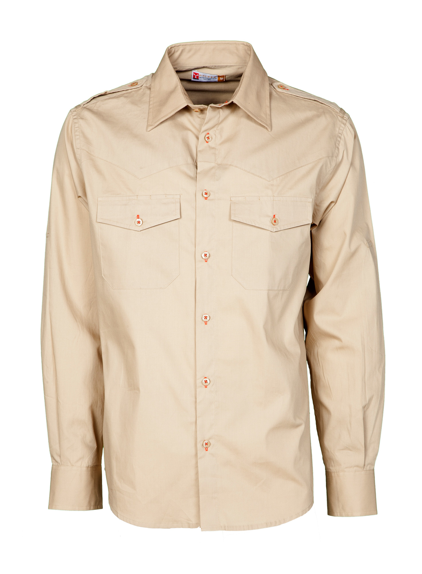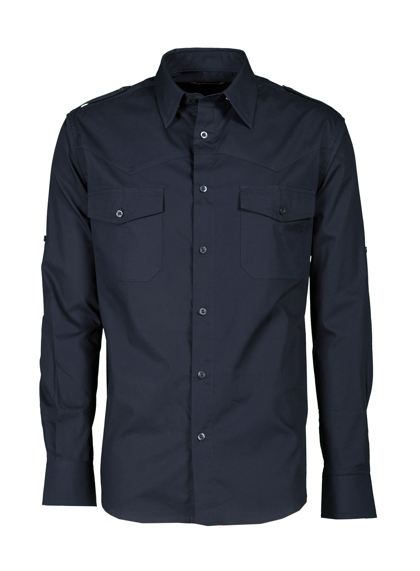 Camicia uomo dal titolo finissimo di cotone pettinato, vestibilità leggermente sfiancata, carrè sul davanti, chiusura con bottoni in tinta e asole in colore a contrasto, spalline, due tasche al petto con patta e asole porta penna, fettuccia con bottone al braccio per il pratico arrotolamento delle maniche. La camicia in colore bianco non ha le asole in colore a contrasto e il carré sul davanti. Trattamento easy care del tessuto.
