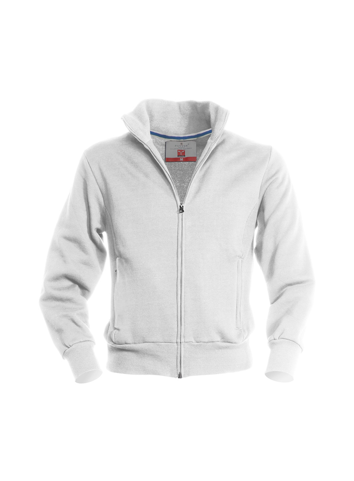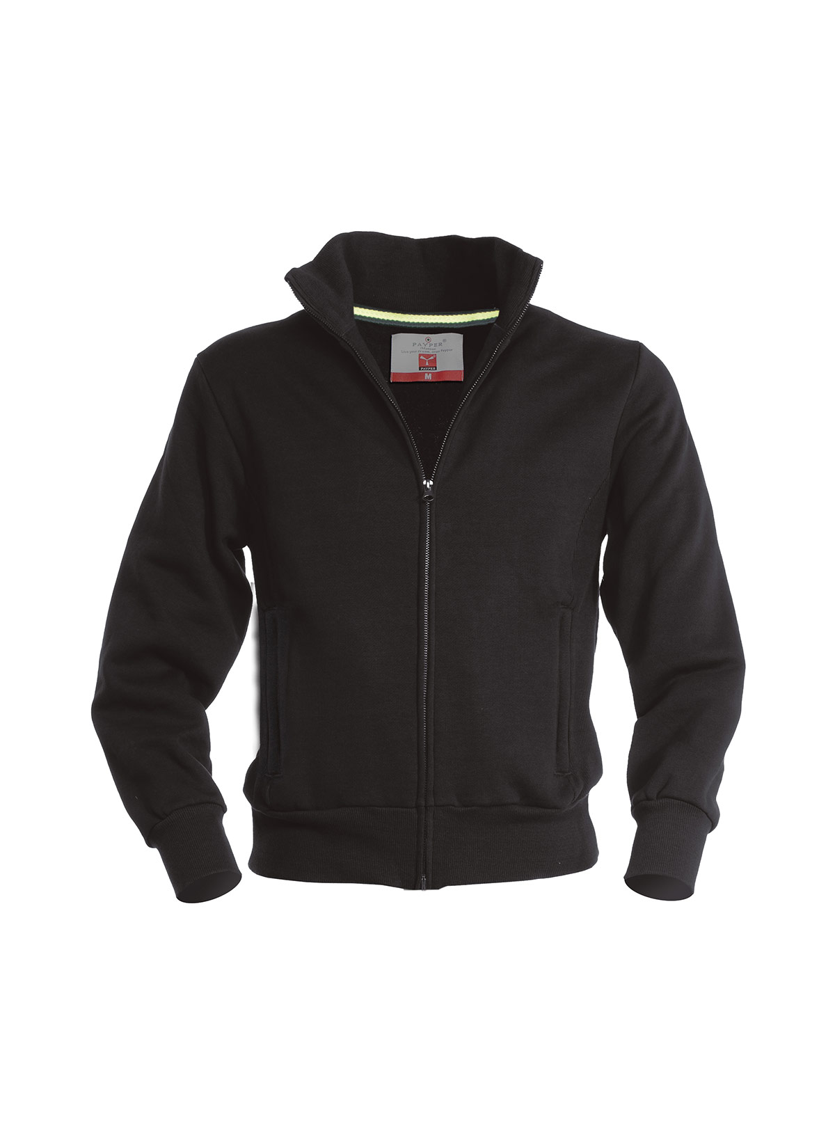 Felpa a zip intera di metallo; fascia ergonomica in rib sui fianchi, polsini, vita e colletto in rib elasticizzato e due tasche laterali con zip.
