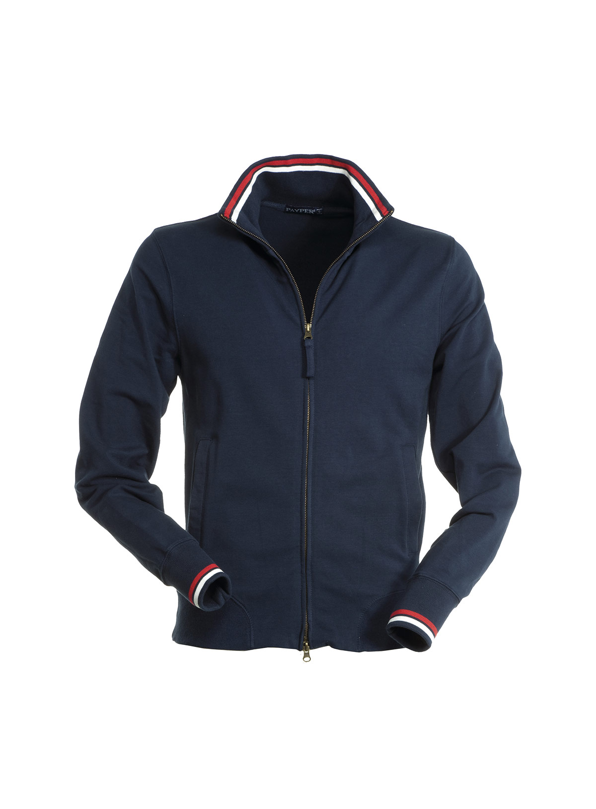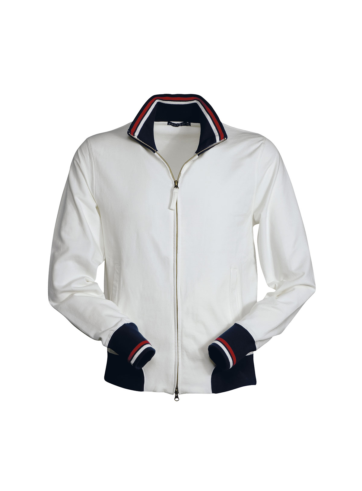 Felpa multistagione a zip intera in metallo con doppio cursore, nascosta; colletto e polsini in rib con righe a contrasto, vita in rib e due tasche laterali.