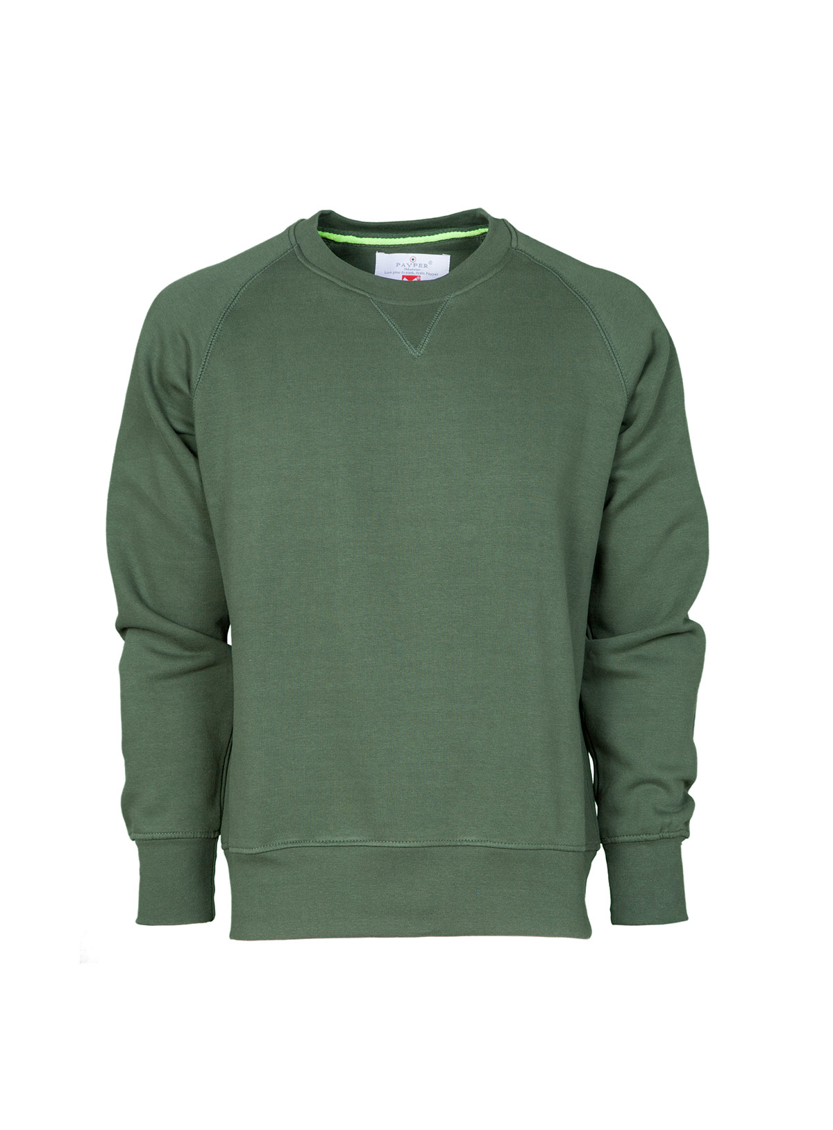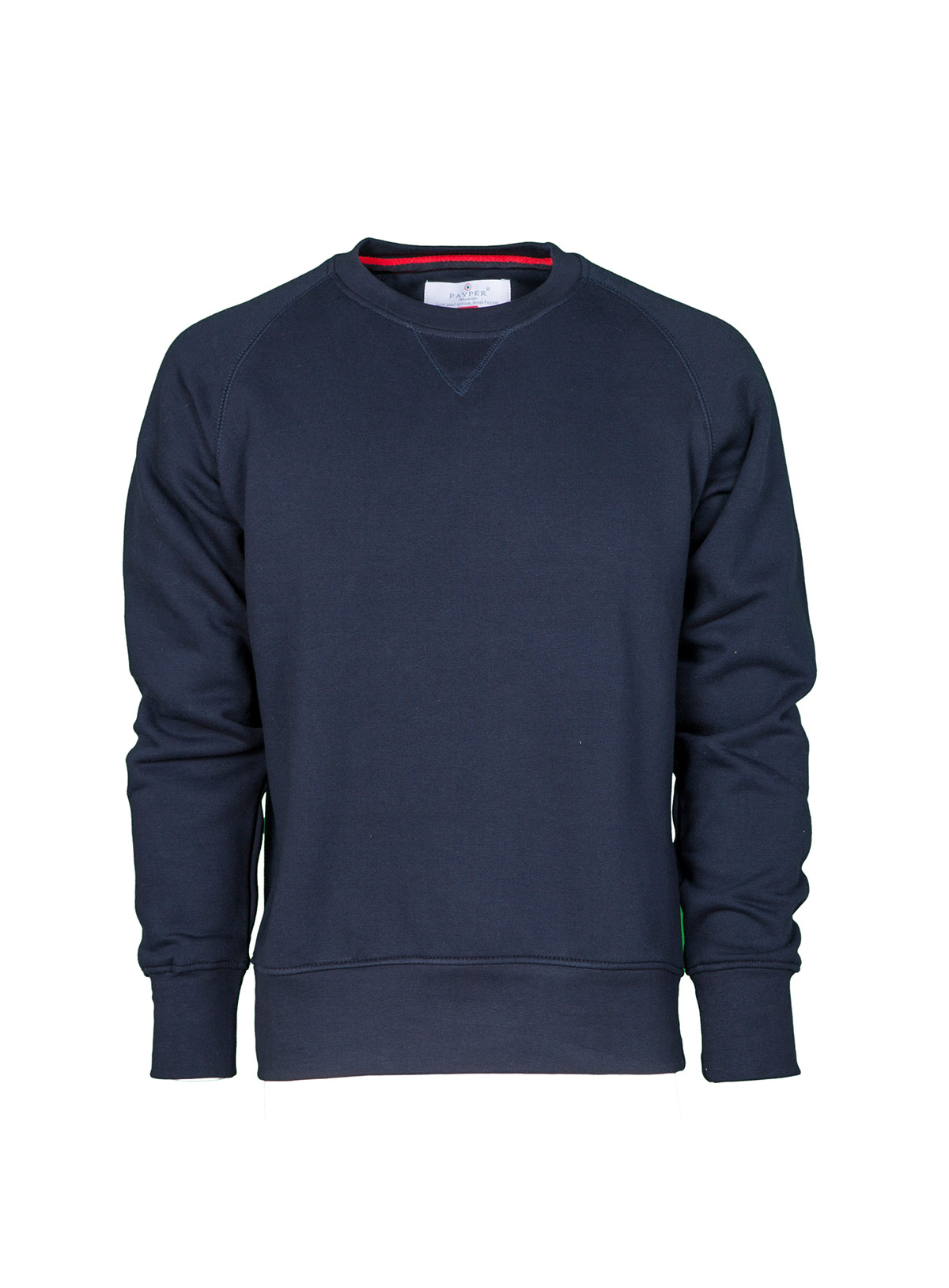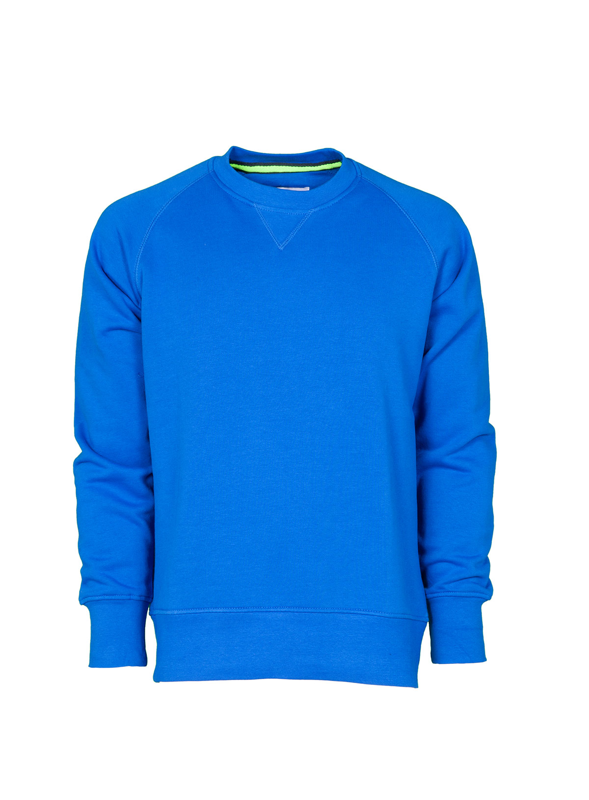 Felpa da uomo a girocollo, manica raglan, cucitura estetica a V al collo; polsini e vita in costina elasticizzata, cuciture rinforzate.