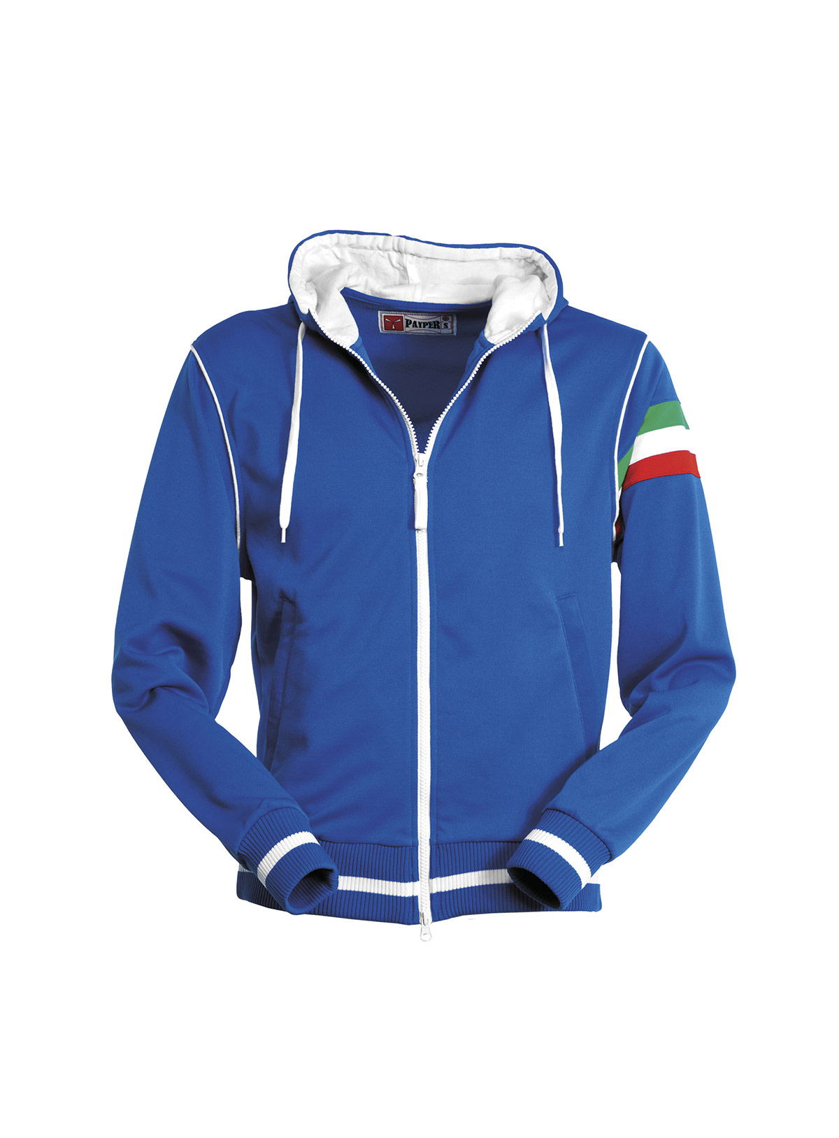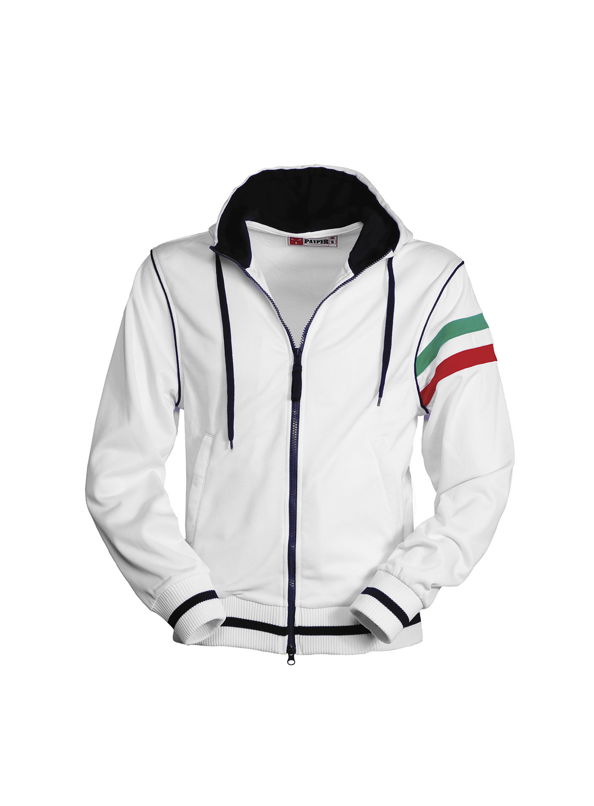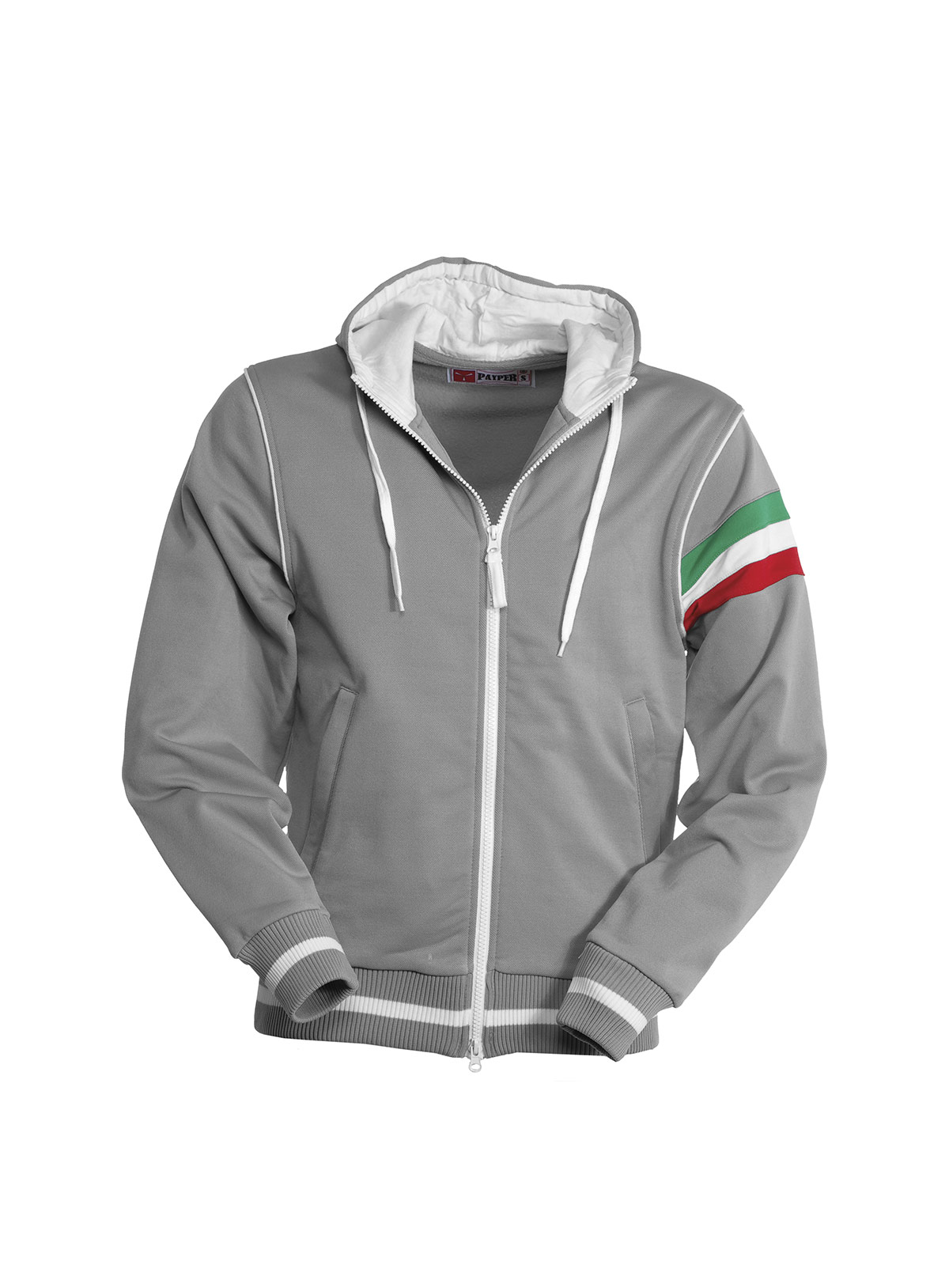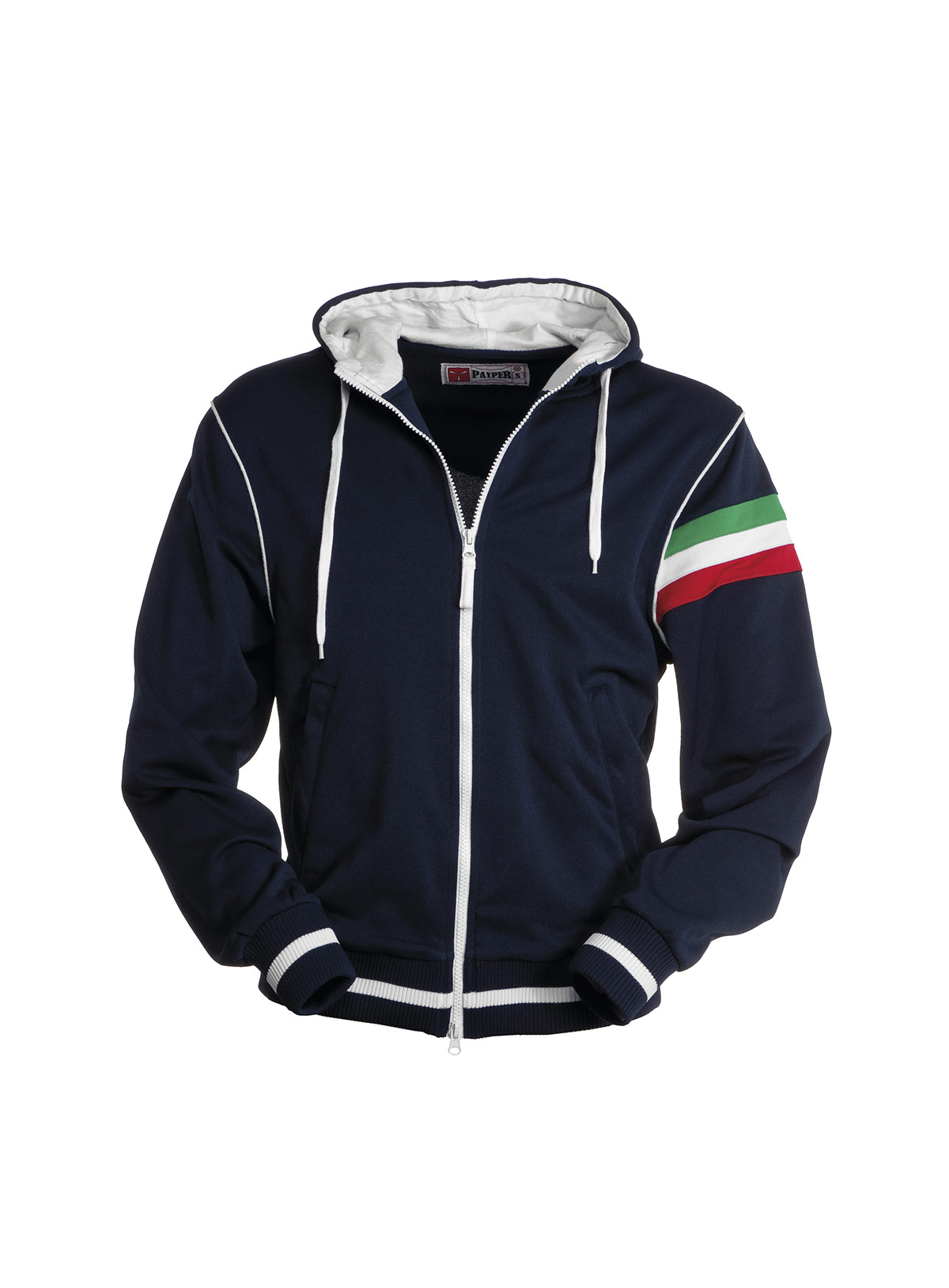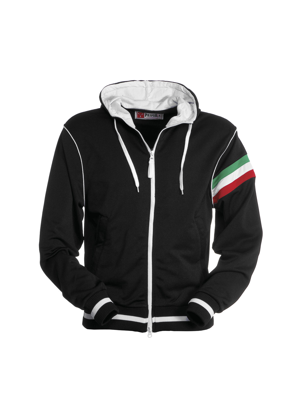 Felpa a zip intera coperta con doppio cursore; cappuccio con coulisse, interno cappuccio e coulisse stessa in colore a contrasto, polsini e vita in costina elasticizzata con profili a contrasto, piping a contrasto nel giromanica, tricolore nel giromanica sinistro, tasche a marsupio con zip, cuciture rinforzate e lavorazione esterna a piquet per una maggiore traspirabilità del capo.