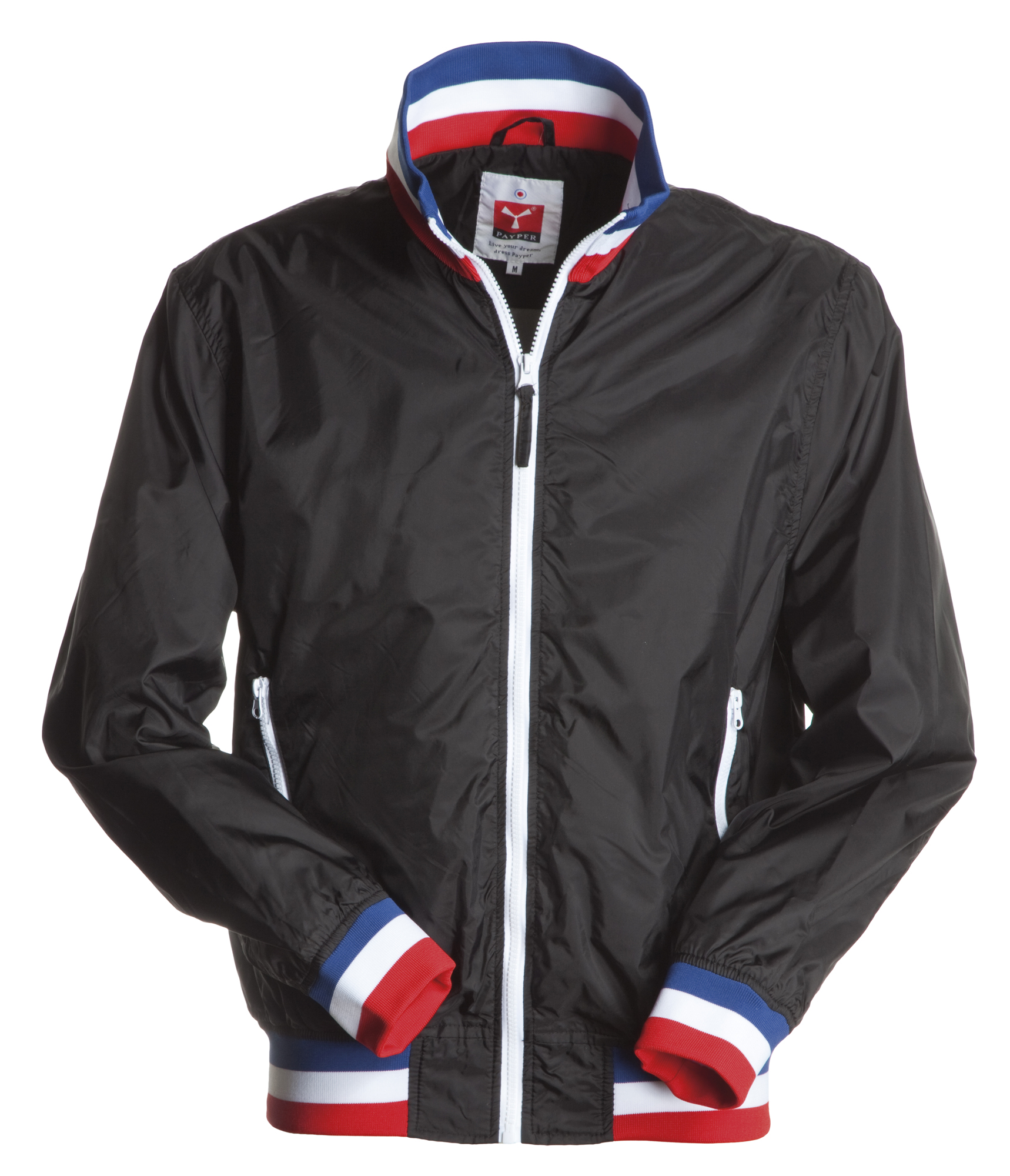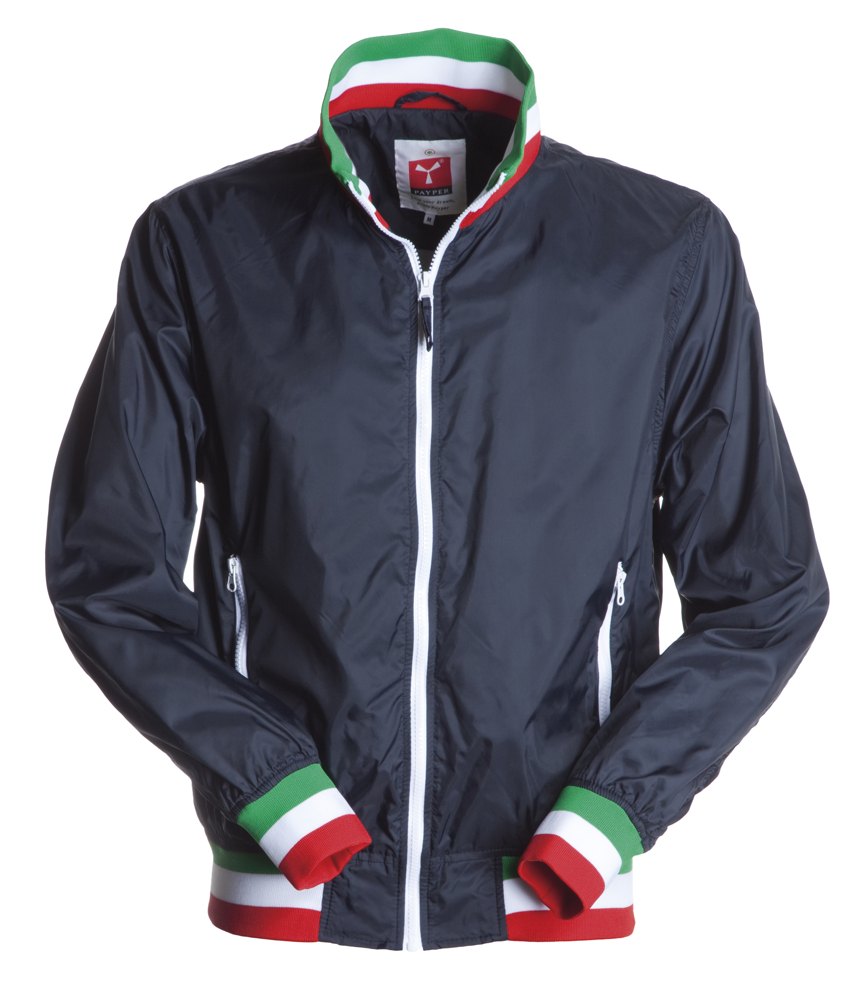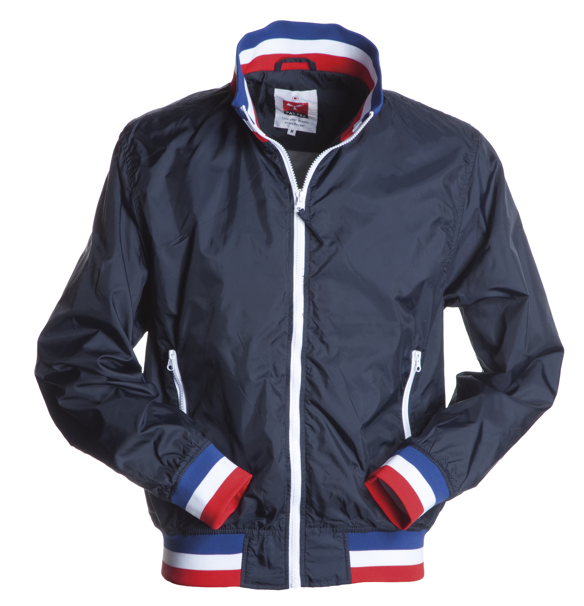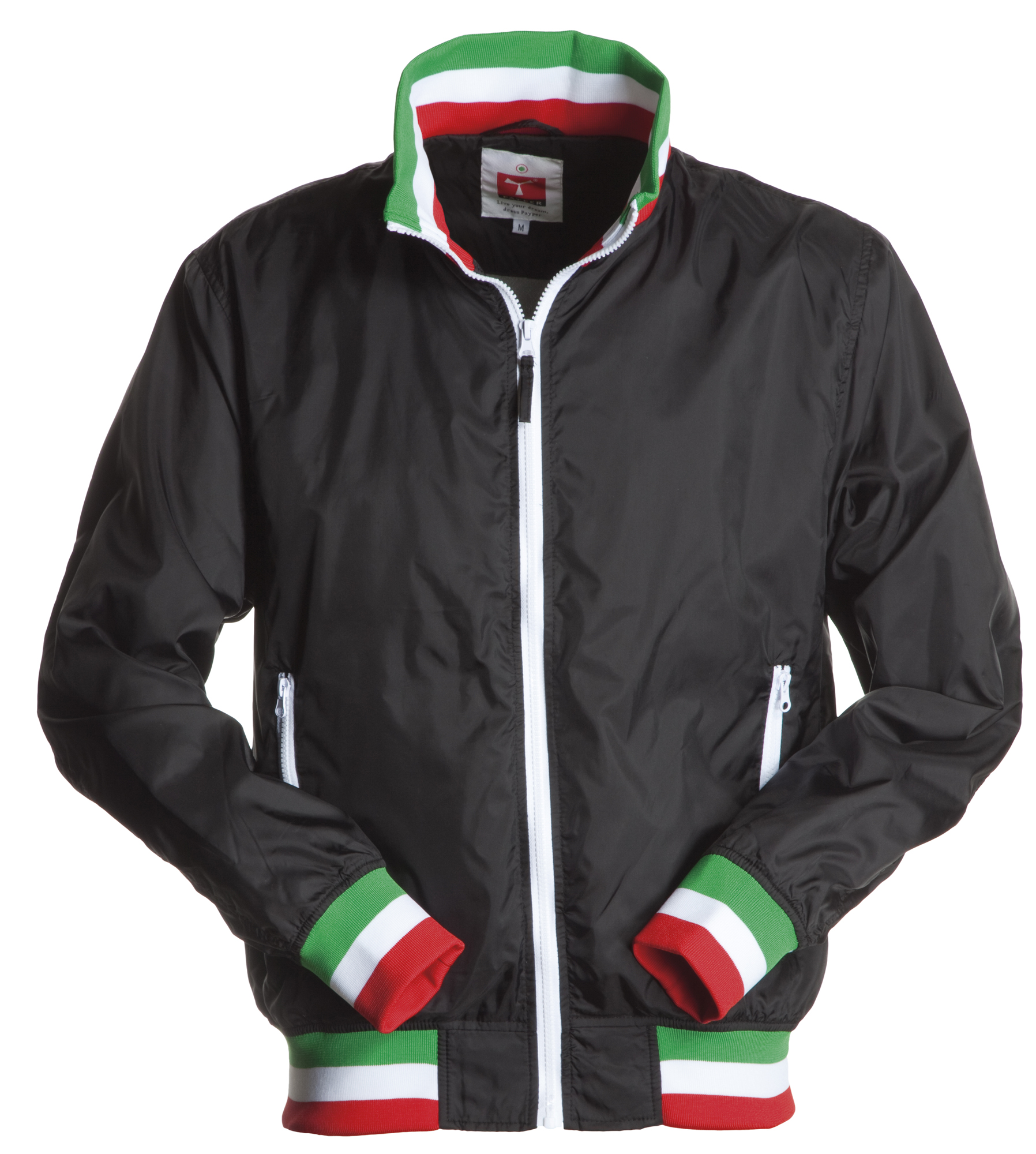 Giubbino con colletto, polsini e vita in rib con colori bandiera, due tasche esterne a filo; interno non imbottito, una tasca interna.