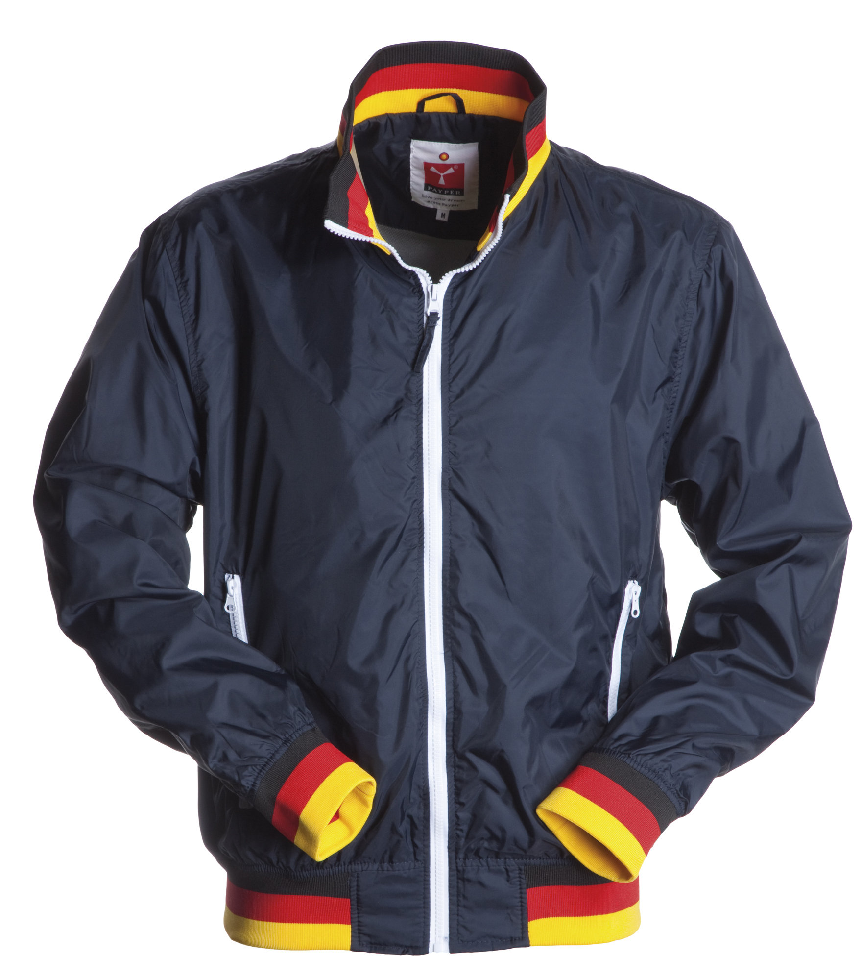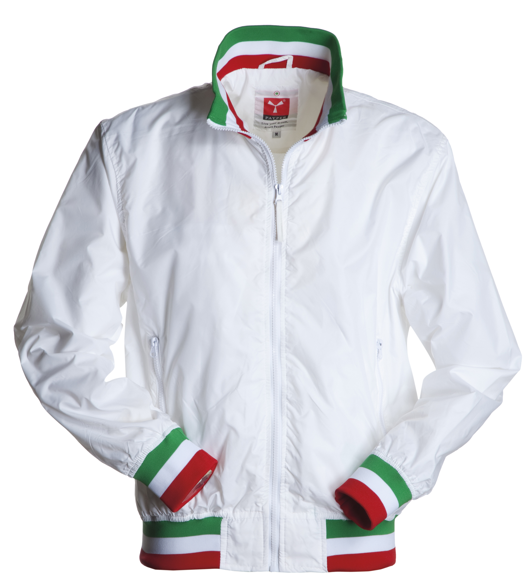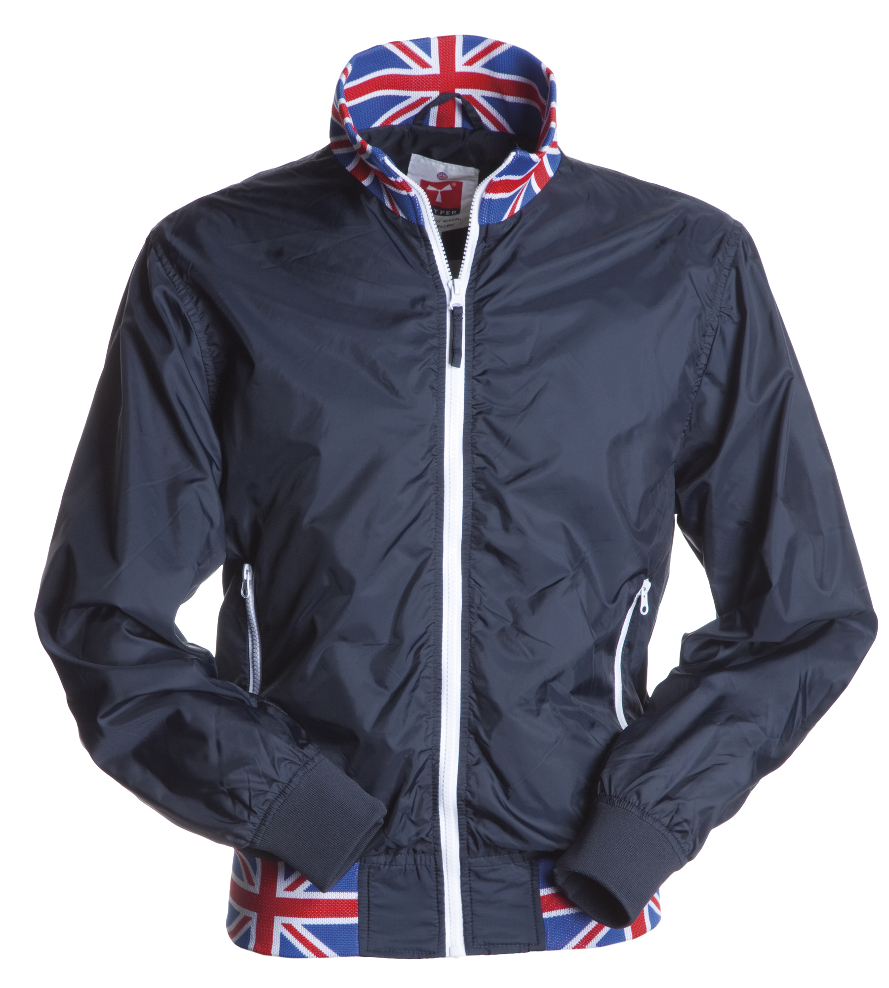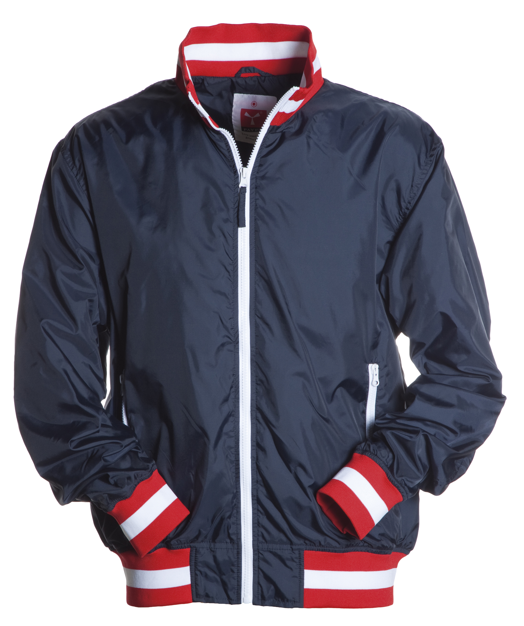 Giubbino con colletto, polsini e vita in rib con colori bandiera, due tasche esterne a filo; interno non imbottito, una tasca interna.