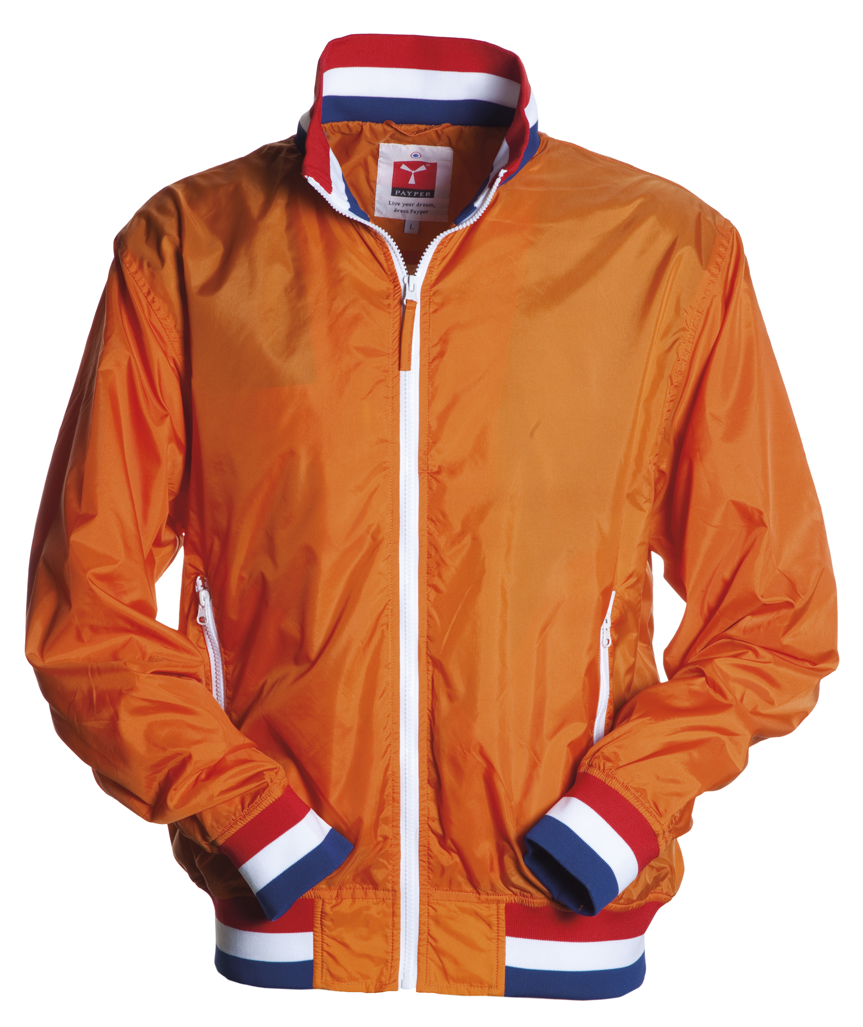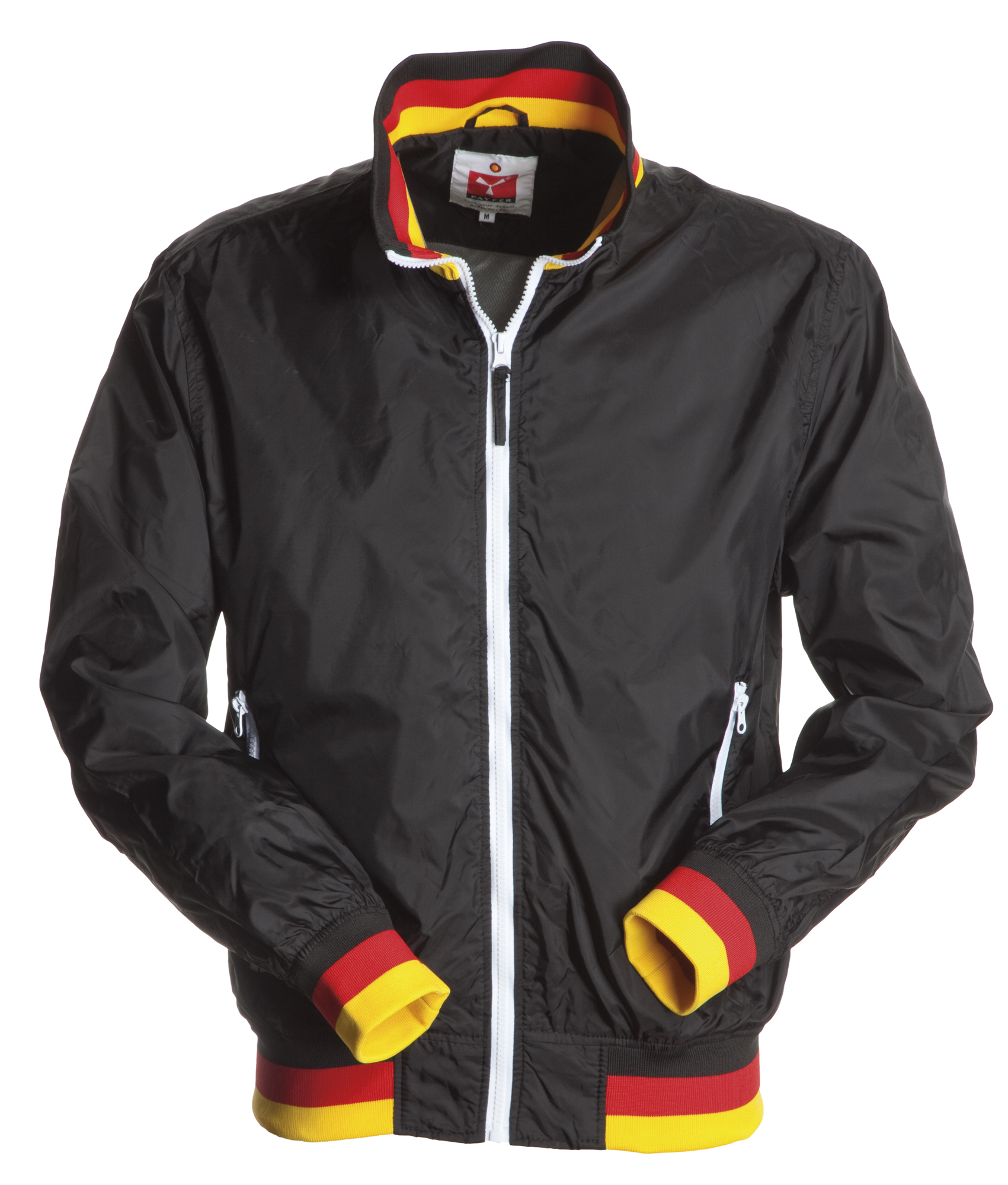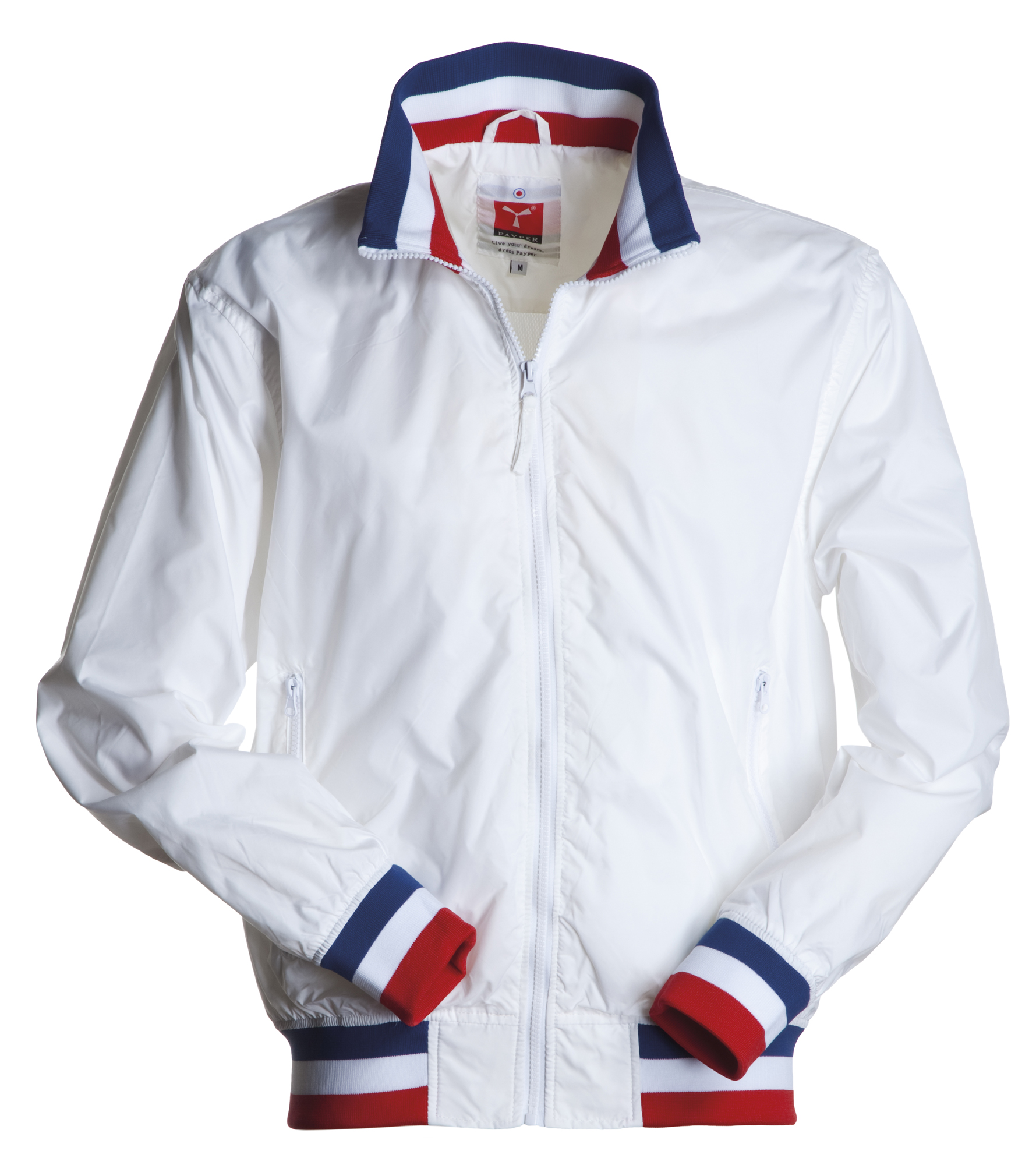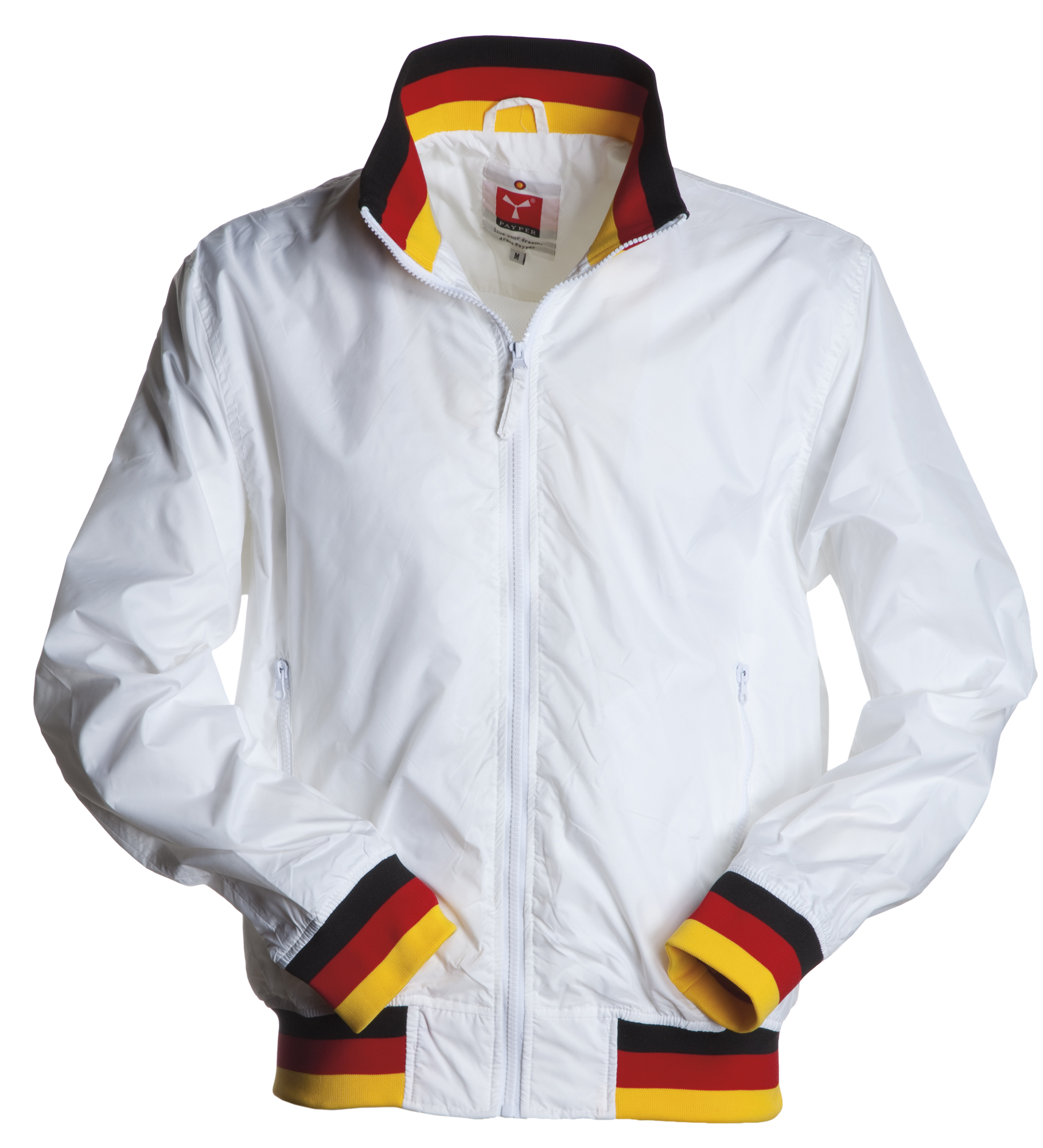 Giubbino con colletto, polsini e vita in rib con colori bandiera, due tasche esterne a filo; interno non imbottito, una tasca interna.