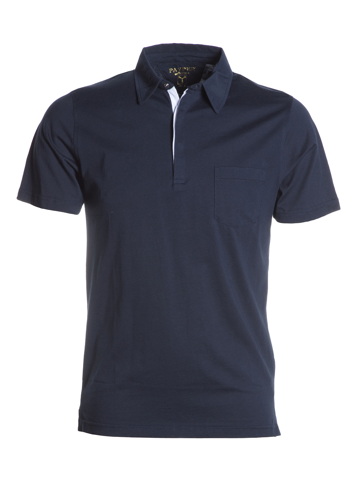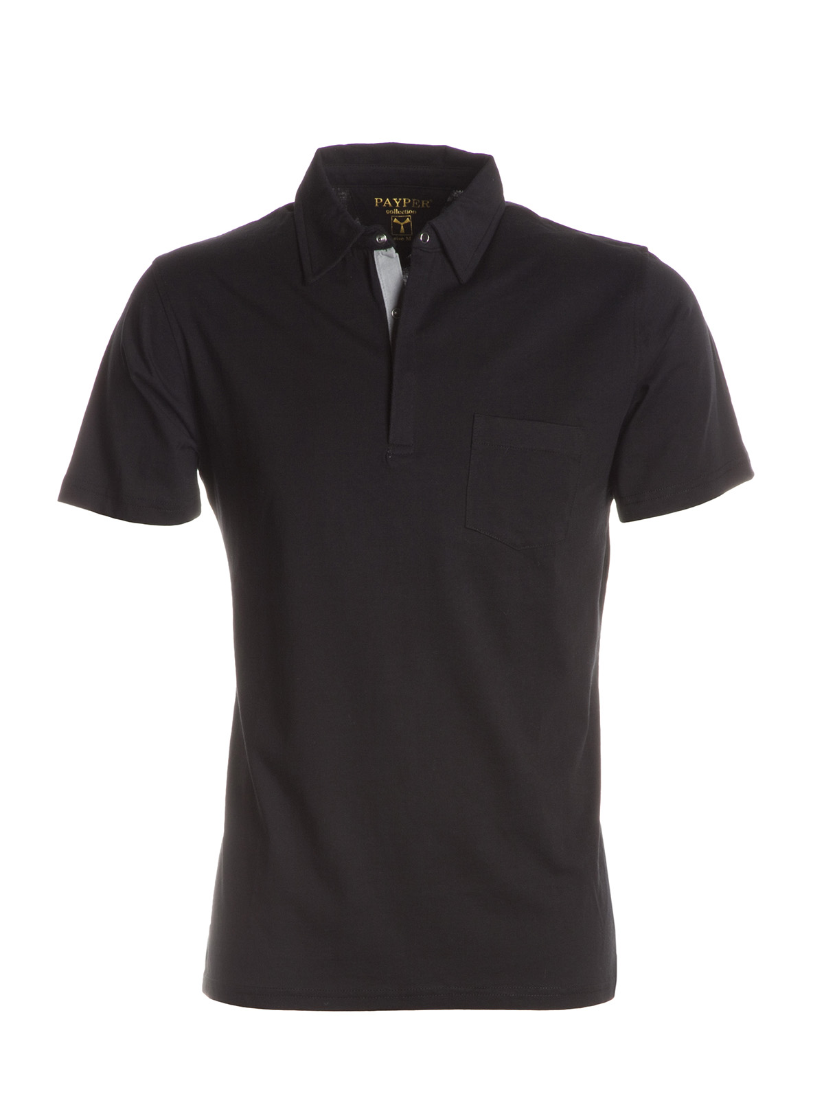 Polo manica corta a tre bottoni automatici a clips di metallo, apertura frontale del collo più fine e profonda, etichetta transfer, taschino lato cuore.