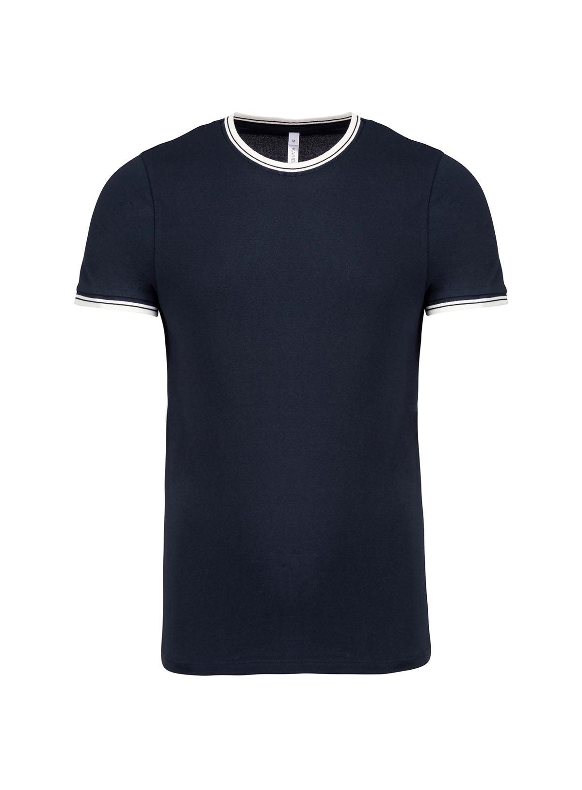 Collo e fondo manica a costine con righe a contrasto. Nastrino di rinforzo sul collo. Finitura a doppia impuntura a fondo capo.